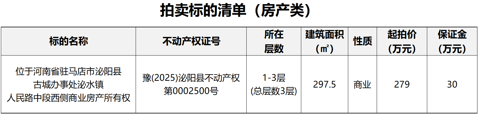 受委托,我公司定于2025年10月22日上午10时开始在淘宝网资产竞价网络平台(网址:zc-paimai.taobao.com)(24小时竞价,延时除外)公开拍卖位于河南省驻马店市泌阳县古城办事处泌水镇人民路中段西侧商业房产所有权【产权证号:豫(2025)泌阳县不动产权第 0002500号】。