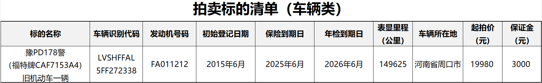 (4)拍卖人提供的车辆信息,如:发动机号、车架号等如与实际不符,以车管部门数据为准,拍卖人不承担任何保证责任,请竞买人自行核实确认。拍卖资料中记载的表显里程仅作参考,如有偏差,以实际为准,拍卖人不承担责任。
