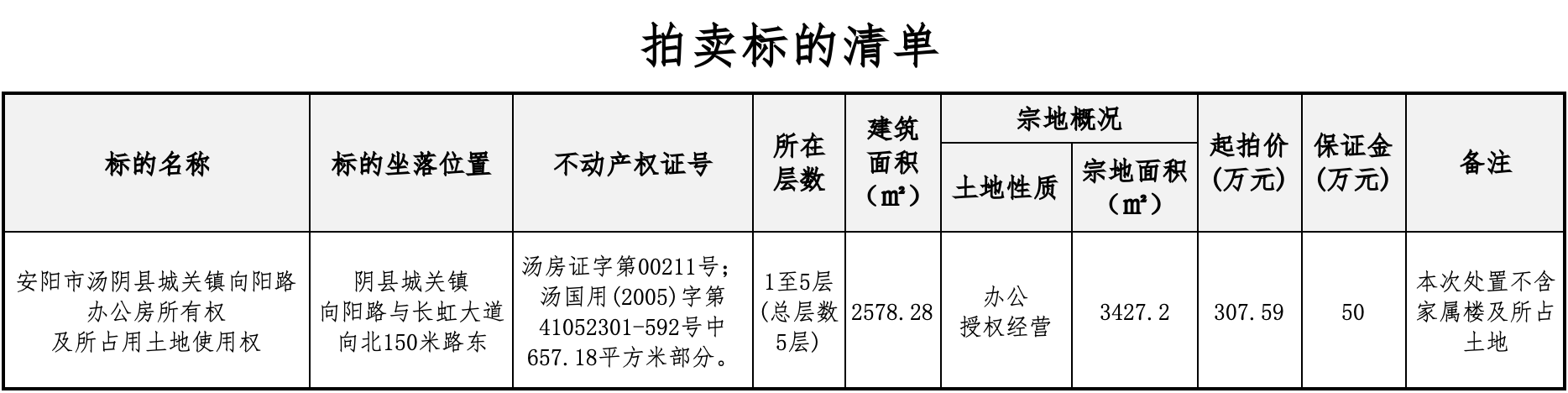 标的所占土地地类(用途)为办公,起拍价及成交价均不包含土地用途改变或变更所需交纳的土地出让金,土地出让金由买受人另行承担。