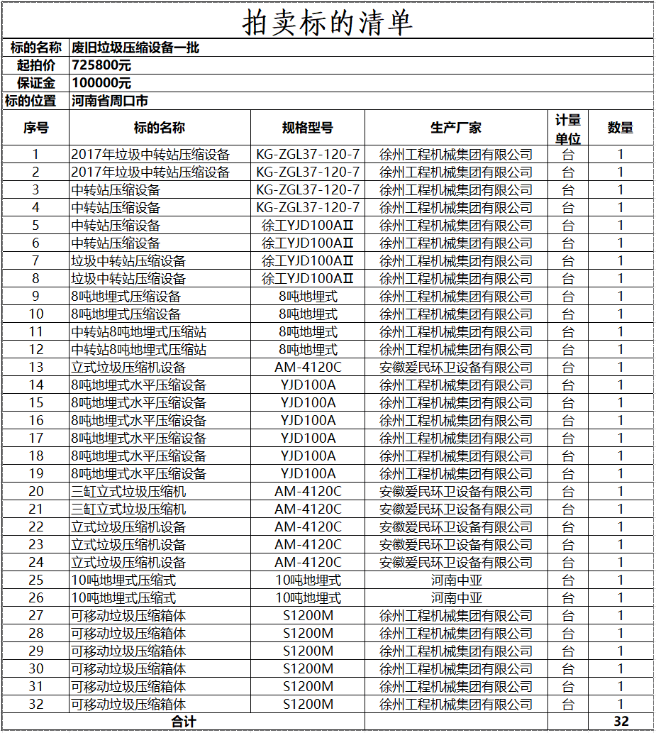 标的图片为垃圾压缩设备类型(立式、地埋式、可移动式),仅供意向人参考,以使用单位交付为准。拍卖成交后,为保证周口市各垃圾中转站内垃圾及时清运不受影响,标的交割时间需根据标的使用单位(周口市环境卫生服务中心)实际交付时间为准,工期约为1-2个月。