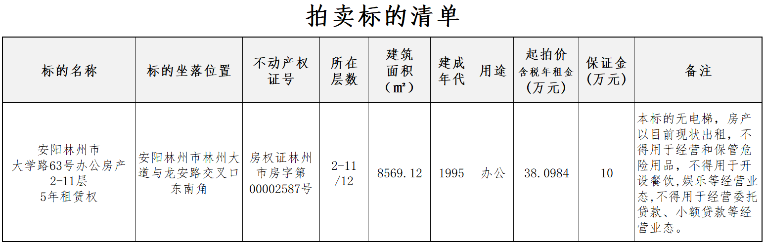 受委托,我公司定于2025年11月12日上午10时开始在淘宝网资产竞价网络平台(网址:https://zc-paimai.taobao.com)(24小时竞价,延时除外)公开拍卖位于林州市大学路63号办公房产2至11层5年租赁权(建筑面积8569.12㎡)。