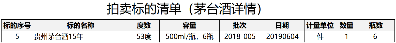 标的5:贵州茅台酒15年1箱共6瓶(2019年)