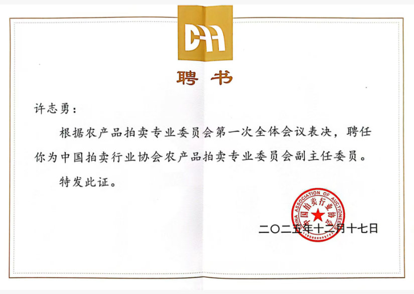 公司董事长许志勇先生,深耕拍卖行业28年,对农产品流通与农村产权交易有着持续的观察与实践。凭借其扎实的专业背景、丰富的行业经验以及在业内的良好声誉,在此次中国拍卖行业协会农产品拍卖专业委员会成立过程中,受聘担任专委会副主任委员。这一身份,既是一份荣誉,更是一份责任。许志勇董事长表示,将积极履行委员职责,积极参与行业研讨与政策建设,与全国同仁携手推动农产品拍卖行业走向更加规范、专业的发展道路。