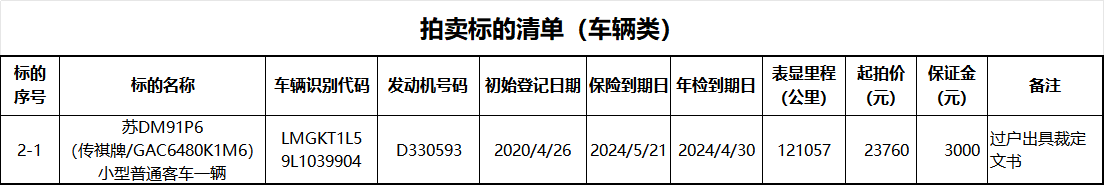 标的:苏DM91P6(传祺牌/GAC6480K1M6)小型普通客车一辆