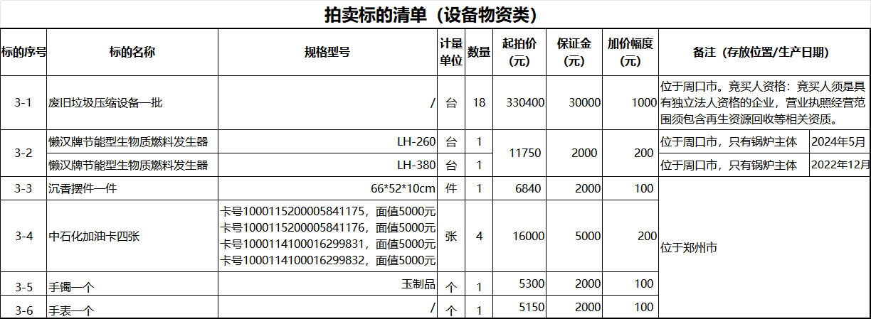(3)本场拍卖会的拍品没有完整的包装,不能退换货,不能提供质量三包,没有售后服务。本次所有标的,由于经过数次交接、搬运、存储,可能存在表面划痕、氧化发霉 、小磕小伤、商标脱落、变形、包装条缺损、条形码、日期不清楚、重量不符等情况,请竞买人通过拍卖人提供的展示方式仔细查验瑕疵。同一项物资可能会存在不同型号规格,现状以实物为准,未现场看货的,竞买成功后如有异议,责任由买受人自行承担。