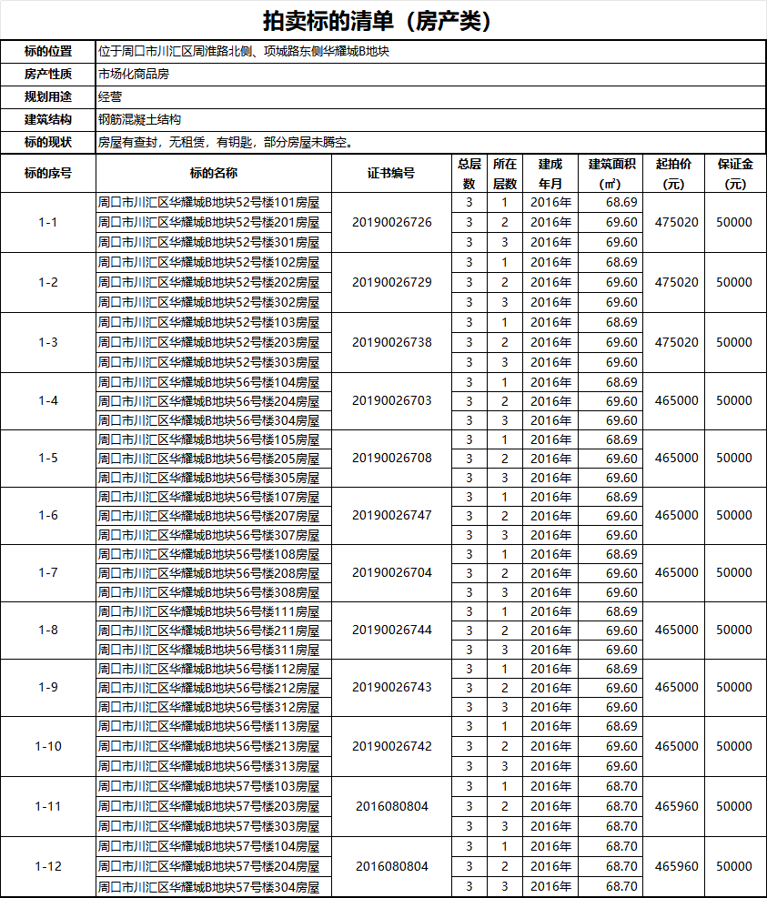 1、位于河南省周口市川汇区周淮路北侧、项城路东侧华耀城B地块12套房屋(共36间);