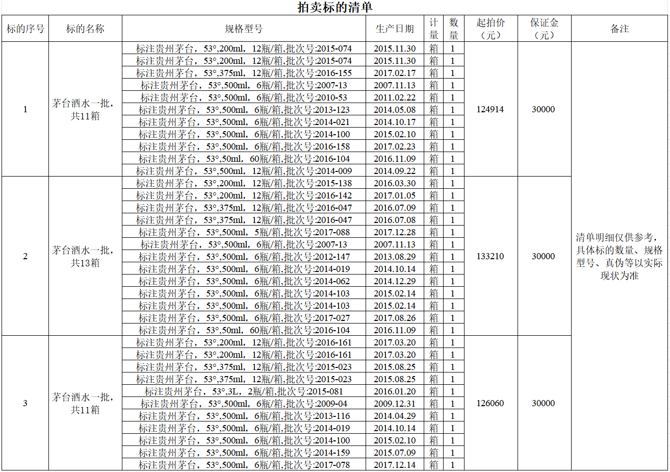 受委托,我公司定于2026年4月15日上午10时开始在淘宝网资产竞价网络平台(网址:https://zc-paimai.taobao.com)(24小时竞价,延时除外)公开拍卖茅台酒水一批。